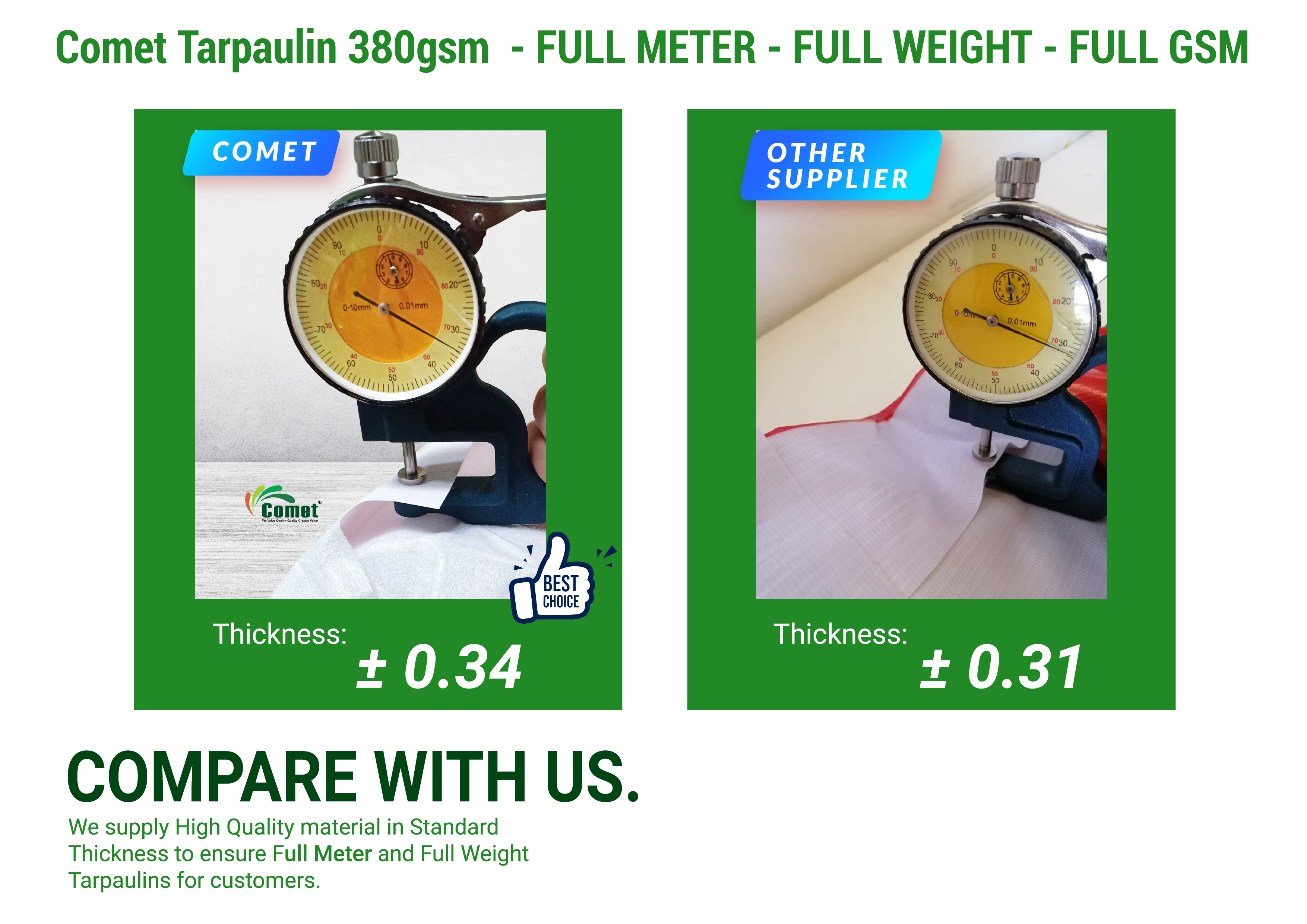Some suppliers sell tarpaulins with lower price but without suffient weight, or tarpaulins with sufficient weight but less gsm. For example, the product may indicate it's 340gsm / 50 meter but actual gsm/ weight given is 300gsm / 47 - 48 meter.